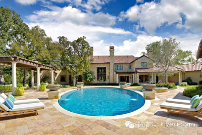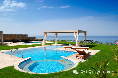 2、地中海风格泳池。地中海风格的泳池以其水的颜色和希腊或罗马式形状而闻名。用石头来装饰是一个不错的选择,用彩色的陶瓷砖来强调水印横线。地中海泳池中的小瀑布也是一个较流行的元素。