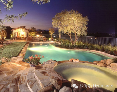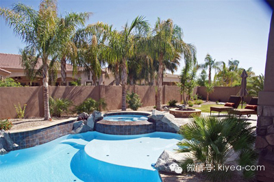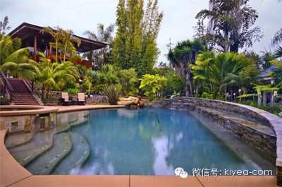 4、热带风泳池。当人们谈起热带泳池时,自然而然出现在脑子里的便是水、放松。热带风格的泳池能给你的院子带来一丝假日的气氛。瀑布、茂密的植物、巨砾和棕榈树都是热带风格的象征。