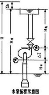 水泵的扬程是指水泵能够扬水的高度,通常用H表示,单位是m。离心泵的扬程以叶轮中心线为基准,分由两部分组成。从水泵叶轮中心线至水源水面的垂直高度,即水泵能把水吸上来的高度,叫做吸水扬程,简称吸程;从水泵叶轮中心线至出水池水面的垂直高度,即水泵能把水压上去的高度,叫做压水扬程,简称压程。即 水泵扬程= 吸水扬程 + 压水扬程 应当指出,铭牌上标示的扬程是指水泵本身所能产生的扬程,它不含管道水流受摩擦阻力而引起的损失扬程。在选用水泵时,注意不可忽略。否则,将会抽不上水来。