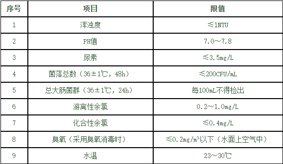 表2 游泳池池水水质常规检验项目及限值